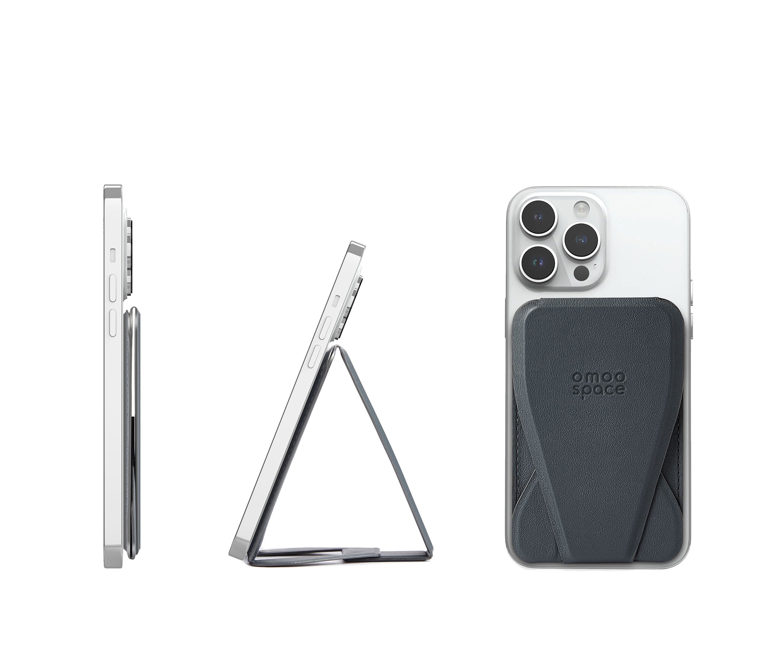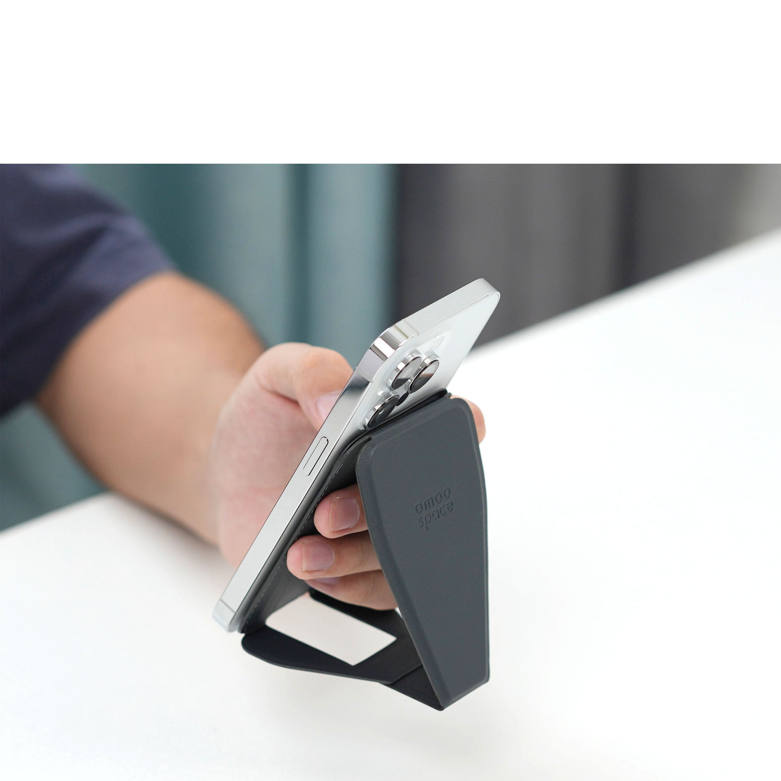 Experience the OMOOSPACE PRO: a sleek, all-in-one accessory that's a kickstand, wallet, and phone mount. Compact and multifunctional, it fits easily in your pocket or bag, simplifying and enhancing your mobile experience